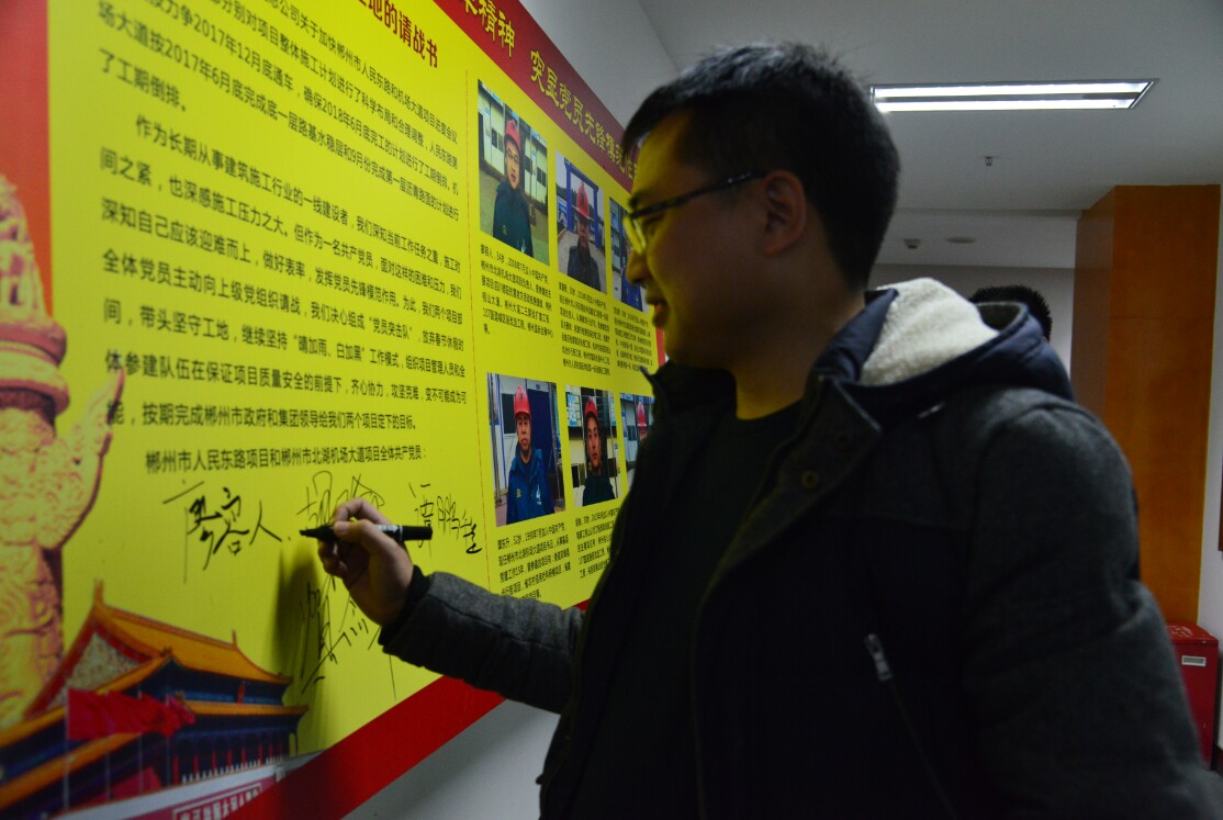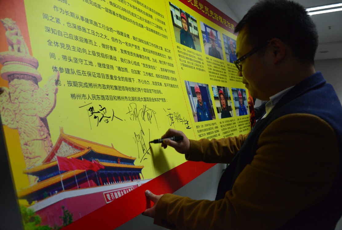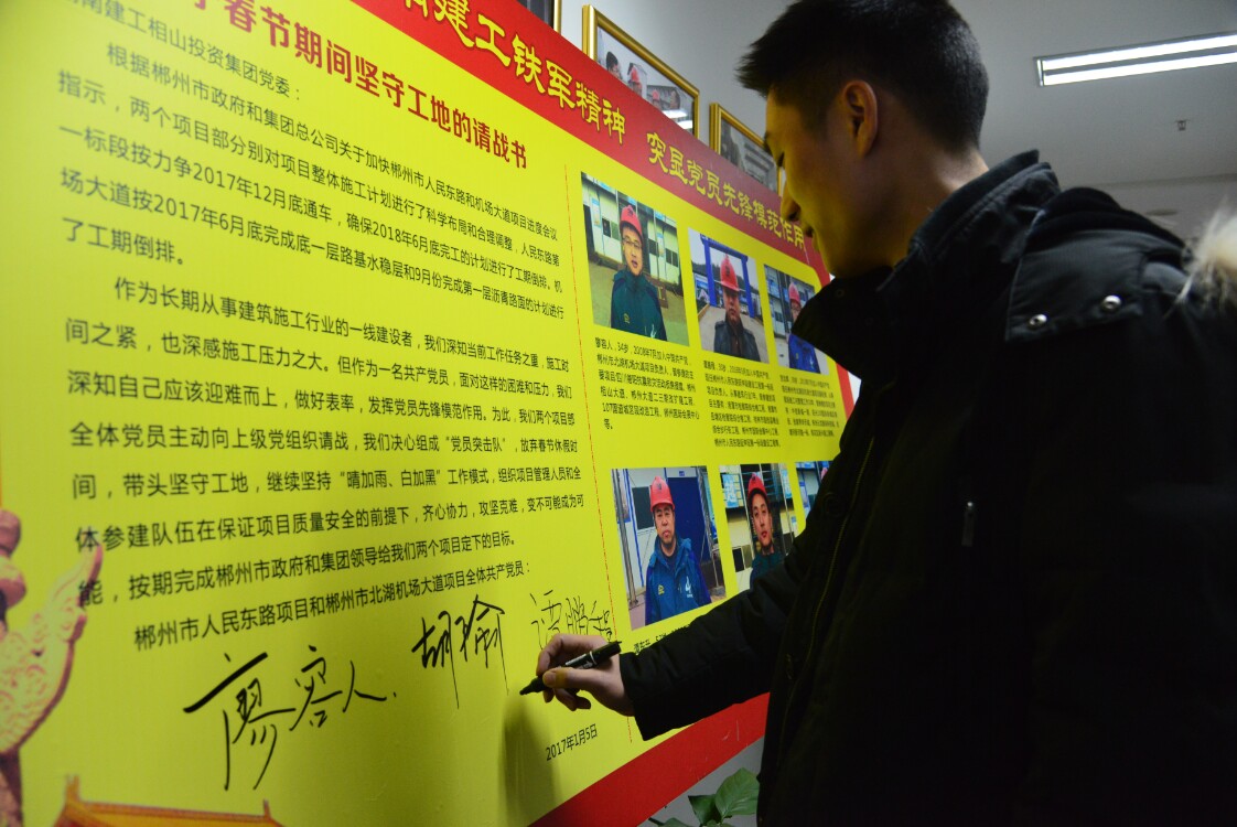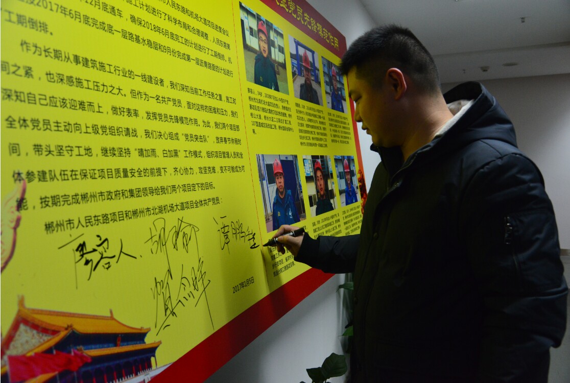 由廖容人、谭鹏程、贺念辉、谭东升、胡瑜、江四清六人组成的党员突击队,在项目部签署了《关于春节期间坚守工地的请战书》,主动放弃春节休假时间,带头坚守工地,继续坚持“晴加雨、白加黑”工作模式,以先进带动全体项目部员工携手奋进,攻坚克难,变不可能成为可能,按期完成郴州市政府和集团领导给两个项目定下的目标。